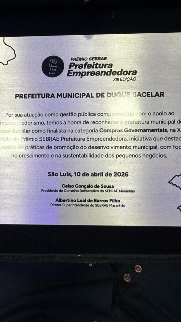 Com visão de futuro, Duque Bacelar segue avançando, investindo no fortalecimento do ambiente de negócios, atraindo investimentos e criando oportunidades reais para sua população. O prêmio não apenas reconhece os resultados já alcançados, mas reforça o potencial de crescimento e transformação do município.